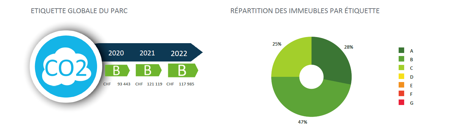 Le rapport annuel pour 2022 attribue à nouveau l’étiquette B à l’ensemble de notre parc immobilier. En effet, la même étiquette verte avait déjà été obtenue en 2020 et 2021. Nous restons donc convaincus qu’une gestion proactive et un bon accompagnement permettent de diminuer notre bilan carbone et de valoriser les actions concrètes réalisées en 2022. La moyenne d’émission de CO2 de notre portefeuille répond donc pleinement aux objectifs de 2030 de la Confédération.